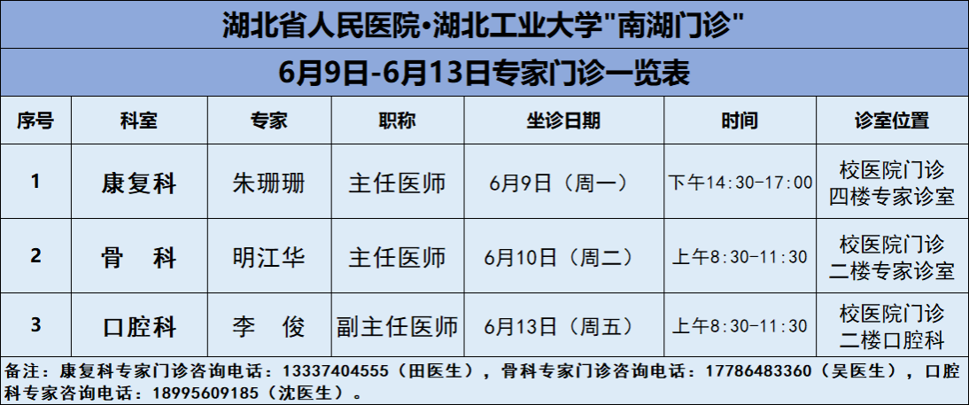 6月9日-6月13日,篮球比分网_篮球比分直播-欧冠买球投注推荐医院将邀请湖北省人民医院知名专家——康复科朱珊珊主任、骨科明江华主任、口腔科李俊副主任三位专家教授前来校医院坐诊(具体坐诊信息见下),请广大师生、周边居民持续关注南湖门诊专家坐诊信息,如有: