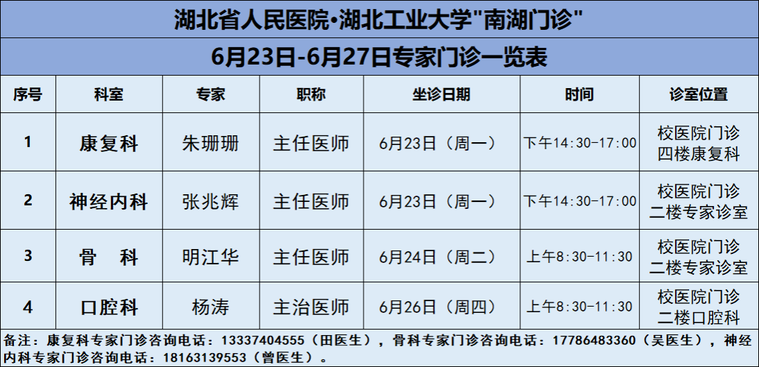 6月23日-6月27日,篮球比分网_篮球比分直播-欧冠买球投注推荐医院将邀请湖北省人民医院知名专家——康复科朱珊珊主任、神经内科张兆辉主任、骨科明江华主任、口腔科杨涛医生四位专家教授前来校医院坐诊(具体坐诊信息见下),请广大师生、周边居民持续关注南湖门诊专家坐诊信息,如有:
