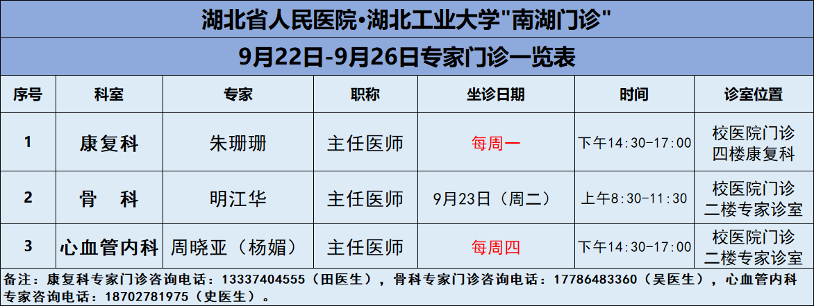 9月22日-9月26日,篮球比分网_篮球比分直播-欧冠买球投注推荐医院将邀请湖北省人民医院知名专家——康复科朱珊珊主任、骨科明江华主任、心内科周晓亚三位专家教授前来校医院坐诊(具体坐诊信息见下),请广大师生、周边居民持续关注南湖门诊专家坐诊信息,如有: