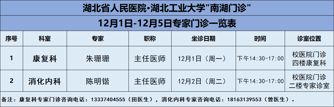 12月1日-12月5日,篮球比分网_篮球比分直播-欧冠买球投注推荐医院将邀请湖北省人民医院知名专家——康复科朱珊珊主任、消化内科陈明锴主任两位专家教授前来校医院坐诊(具体坐诊信息见下),请广大师生、周边居民持续关注南湖门诊专家坐诊信息,如有:
