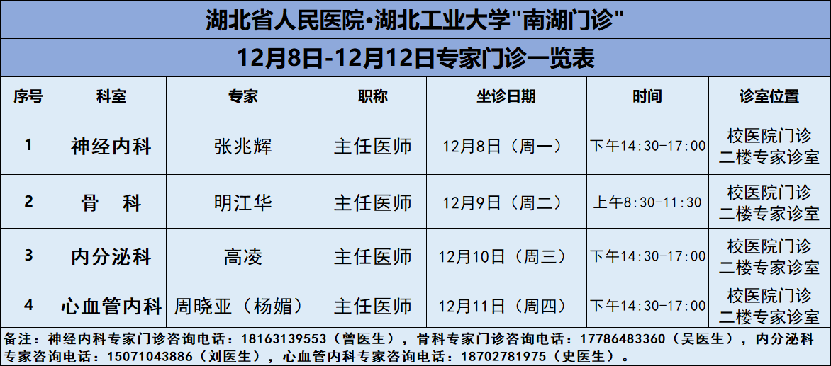12月8日—12月12日,篮球比分网_篮球比分直播-欧冠买球投注推荐医院将邀请湖北省人民医院知名专家——神经内科张兆辉主任、骨科明江华主任、内分泌科高凌主任、心内科周晓亚主任三位专家教授前来校医院坐诊(具体坐诊信息见下)。请广大师生、周边居民持续关注南湖门诊专家坐诊信息,如有: