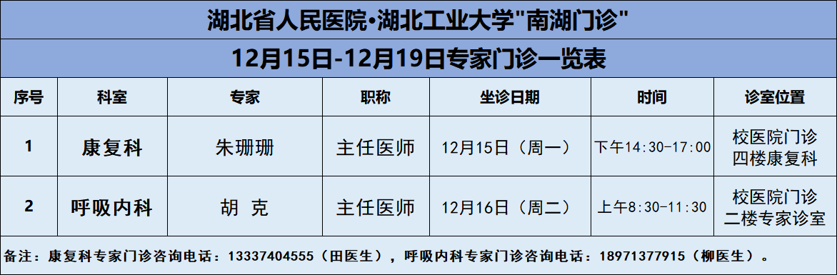 12月15日-12月19日,篮球比分网_篮球比分直播-欧冠买球投注推荐医院将邀请湖北省人民医院知名专家——康复科朱珊珊主任、呼吸内科胡克主任两位专家教授前来校医院坐诊(具体坐诊信息见下),请广大师生、周边居民持续关注南湖门诊专家坐诊信息,如有: