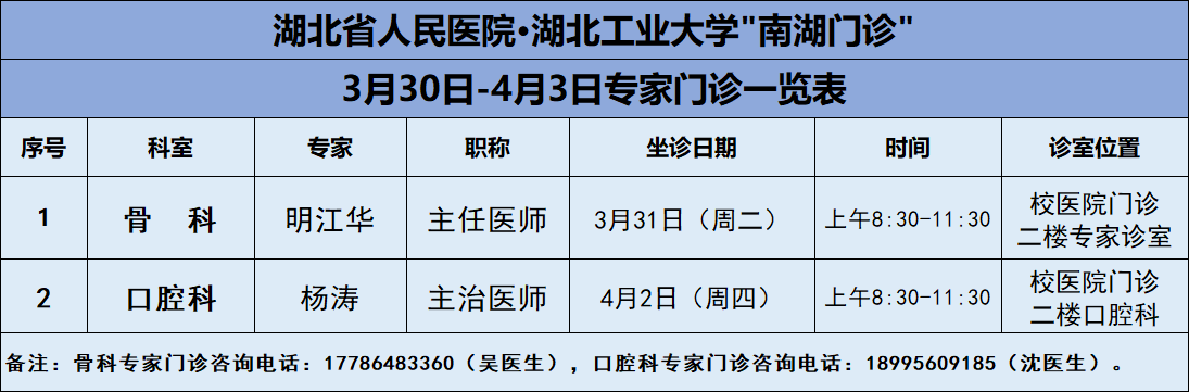 3月30日-4月3日,篮球比分网_篮球比分直播-欧冠买球投注推荐医院将邀请湖北省人民医院知名专家——骨科明江华主任、口腔科杨涛医生两位专家教授前来校医院坐诊(具体坐诊信息见下),请广大师生、周边居民持续关注南湖门诊专家坐诊信息,如有: