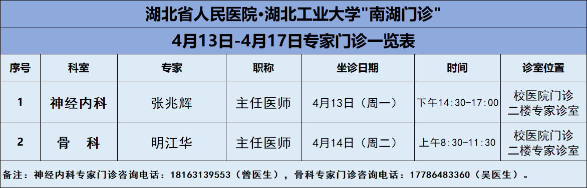 4月13日-4月17日,篮球比分网_篮球比分直播-欧冠买球投注推荐医院将邀请湖北省人民医院知名专家——骨科明江华主任、神经内科张兆辉主任两位专家教授前来校医院坐诊(具体坐诊信息见下),请广大师生、周边居民持续关注南湖门诊专家坐诊信息,如有: