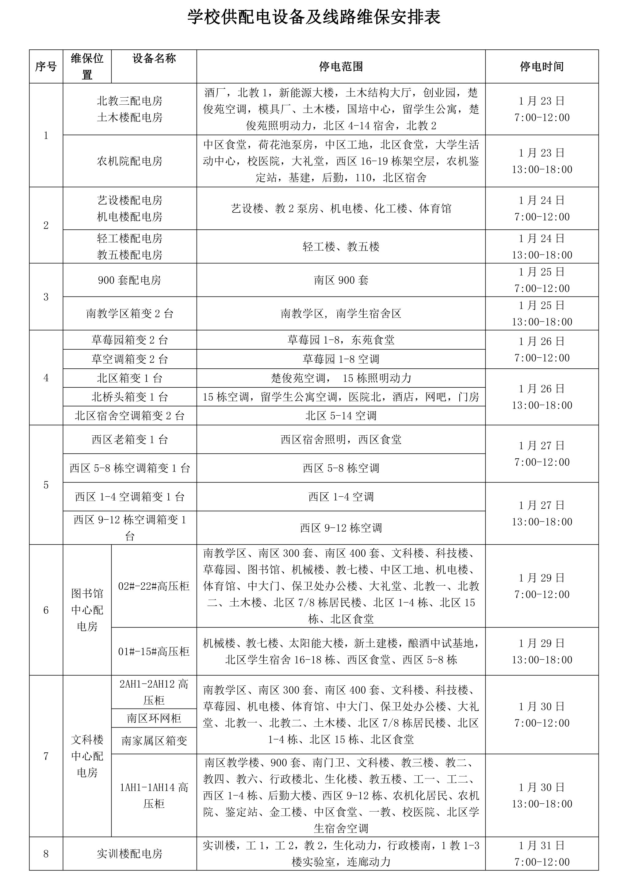 篮球比分网_篮球比分直播-欧冠买球投注推荐配电房及箱式变电站数量较多,投入使用年限较长,部分设备出现元器件老化情况,存在供电隐患,为确保校园电力系统安全稳定运行,并提升供电质量,拟于1月23-31日期间实施“篮球比分网_篮球比分直播-欧冠买球投注推荐供配电设备高低压检测及维护”项目(篮球比分网_篮球比分直播-欧冠买球投注推荐已批准立项),期间校内部分区域、单位将分时出现短时停电、停水,烦请提前做好安排,避免对工作、生活造成影响。