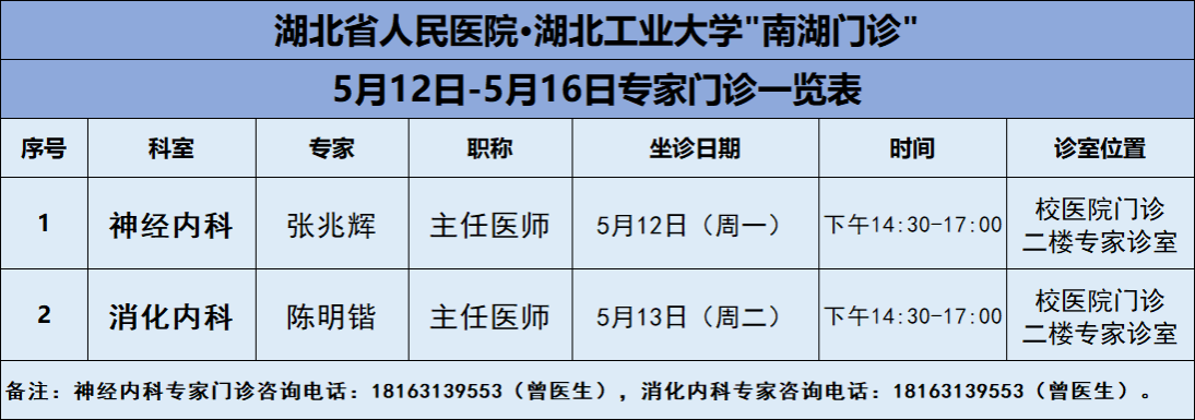 5月12日-5月16日,篮球比分网_篮球比分直播-欧冠买球投注推荐医院将邀请湖北省人民医院知名专家——神经内科张兆辉主任、消化内科陈明锴主任二位专家教授前来校医院坐诊(具体坐诊信息见下),请广大师生、周边居民持续关注南湖门诊专家坐诊信息,如有: