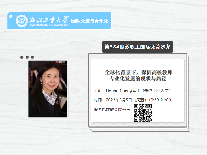 加群时请备注“单位+姓名+工号”,进群后及时按“学院+姓名”格式更名,并添加“湖工大国际”微信公众号,关注相关通知。在不影响正常工作的原则下,全校教职工均可灵活参加沙龙,本沙龙不收取任何费用。
